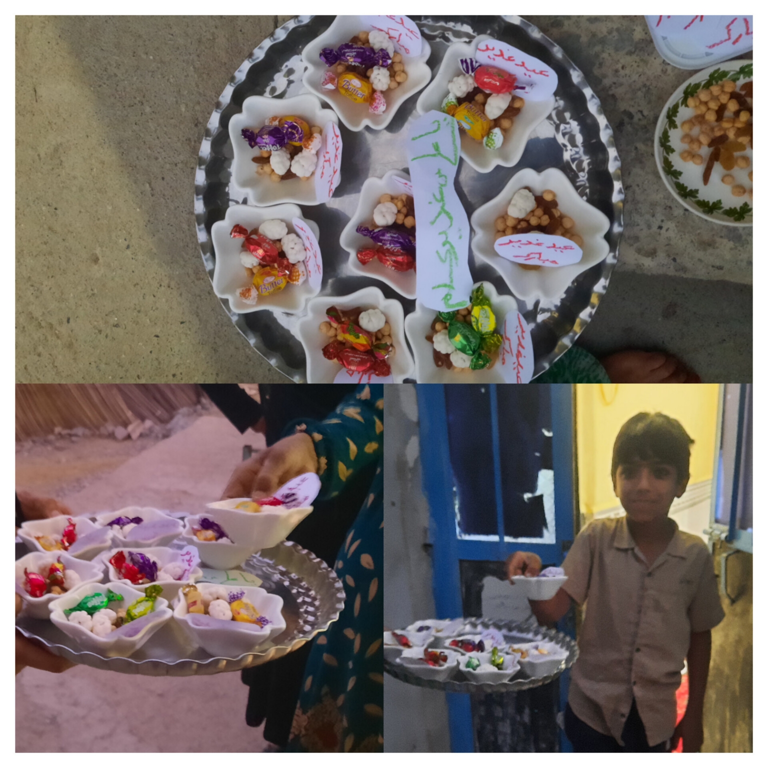 کانون فرهنگی هنری قائم ال محمد (ص)جهت عرض تبریک عید غدیر بسته های نذری را بسته بندی کرد و درب منازل روستا دادند این بسته ها حاوی نقل و شکلات و نخودچی وکشمش بودند که روی هر کدام پیام عید غدیر مبارک وجود داشت