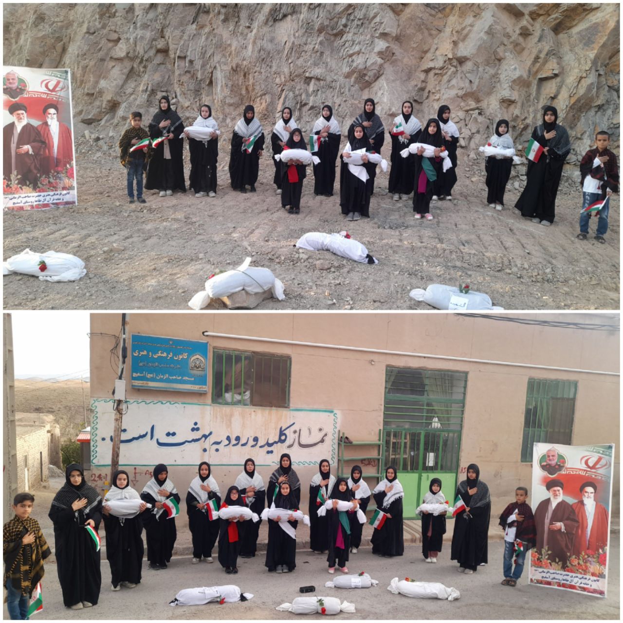 در ایام دفاع مقدس گروه سرود پیروان ولایت از کانون فرهنگی هنری صاحب الزمان عج در محل روستا و کنار جاده اصلی روستا به حمایت از بچه های غزه سرود اجراء کردند.