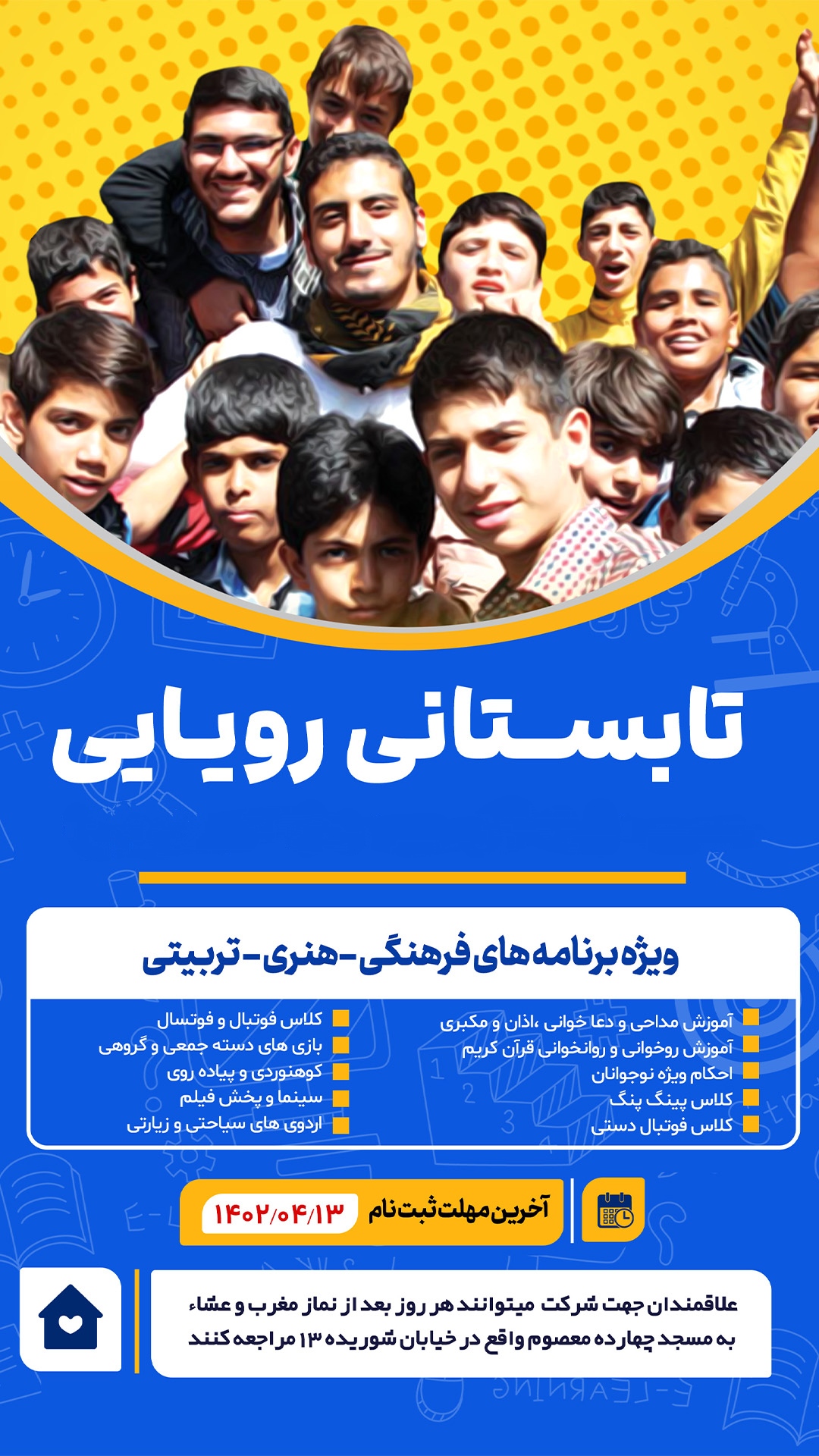 با شروع ایام تابستان کلاس های کانون فرهنگی هنری آیتالله خامنهای شروع شده است و علاقهمندان میتوانند برای ثبت نام بعد از نماز مغرب و عشاء به کانون فرهنگی...