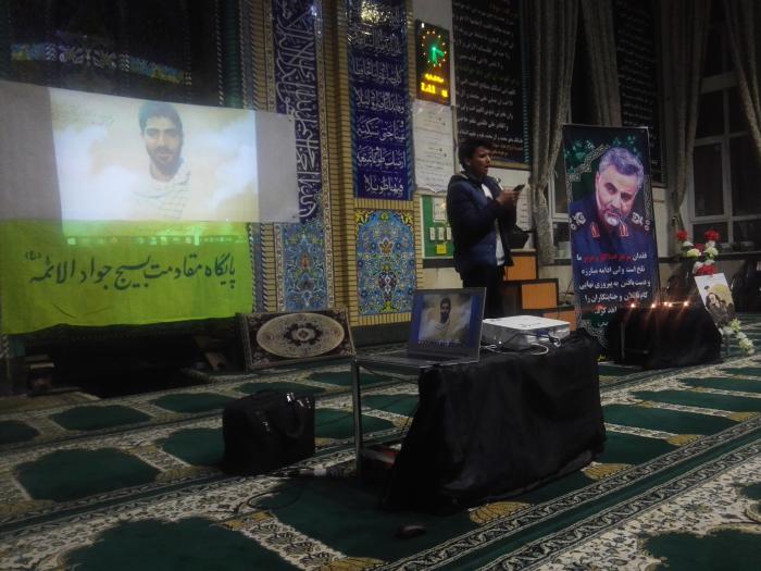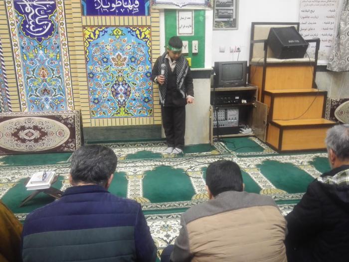 اجرای برنامه دکلمه خوانی توسط نوجوان بسیجی کانون در مدح شهید سلیمانی با حضور بسیجیان و نمازگزاران مسجد برگزار شد.
